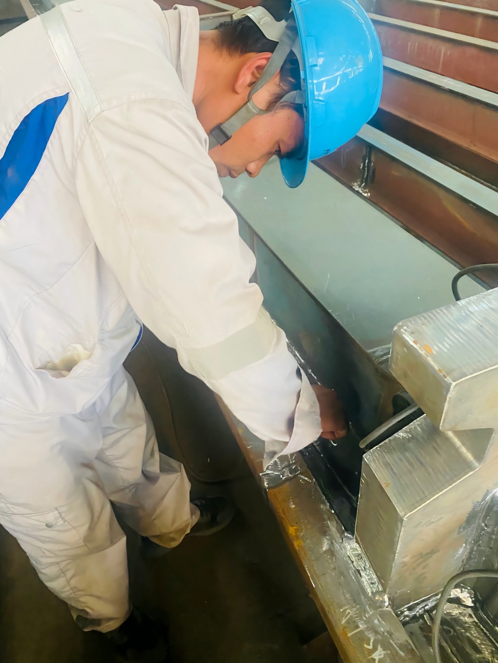 图为厂工队舱口盖内部焊接、打磨工作